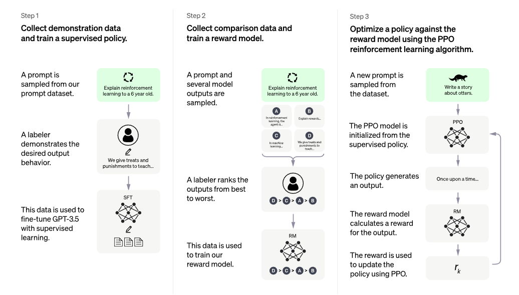 So it looks like currently ChatGPT still requires a good amount of human guidance in the form of AI trainers is required in order to optimize its algorithm. AI trainers utilize demonstration data to train policies, and sample outputs are presented from several different models. The outputs are ranked by performance and the results are used to further train the reward model. A more detailed explanation with illustrations can be seen below.